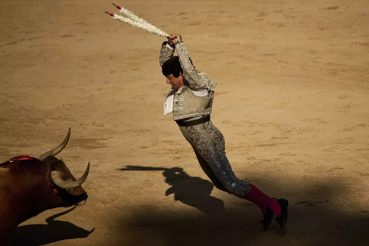 Spanish banderillero José Chacón performs during a bullfight at the San Fermín Festival in Pamplona, northern Spain, on Thursday, July 10, 2025. (AP Photo/Miguel Oses)