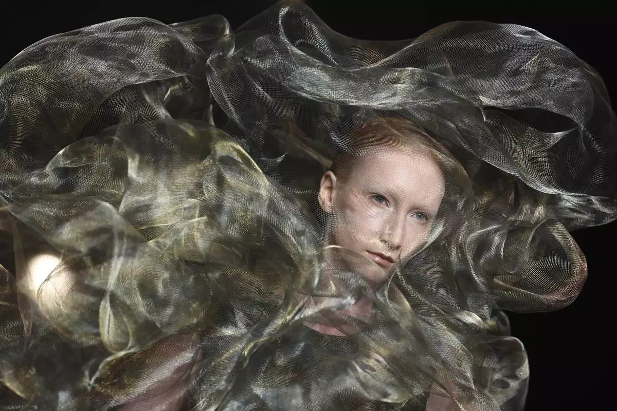 A model wears a creation as part of the Iris van Herpen Fall-Winter 2025/26 Haute Couture collection presented Monday, July 7, 2025, in Paris. (AP Photo/Tom Nicholson)