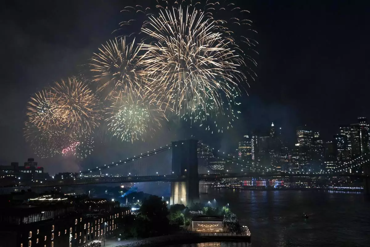 Fireworks light up the sky above the Brooklyn Bridge during Fourth of July celebrations on Friday, July 4, 2025, in New York. (AP Photo/Yuki Iwamura)