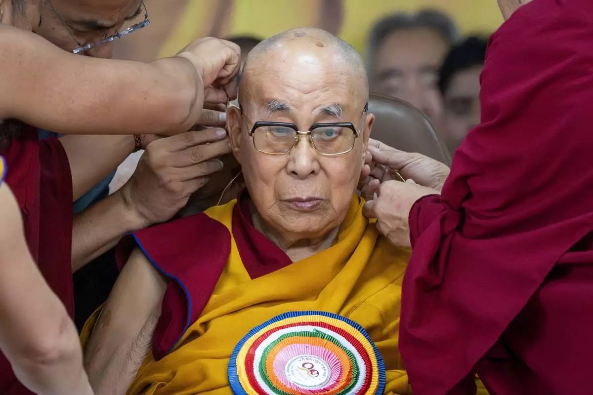 Attendant monks help put a microphone on the spiritual leader of Tibetan Buddhists, the Dalai Lama, during his 90th birthday celebration at the Tsuglakhang temple in Dharamshala, India, Sunday, July 6, 2025.(AP Photo/Ashwini Bhatia)