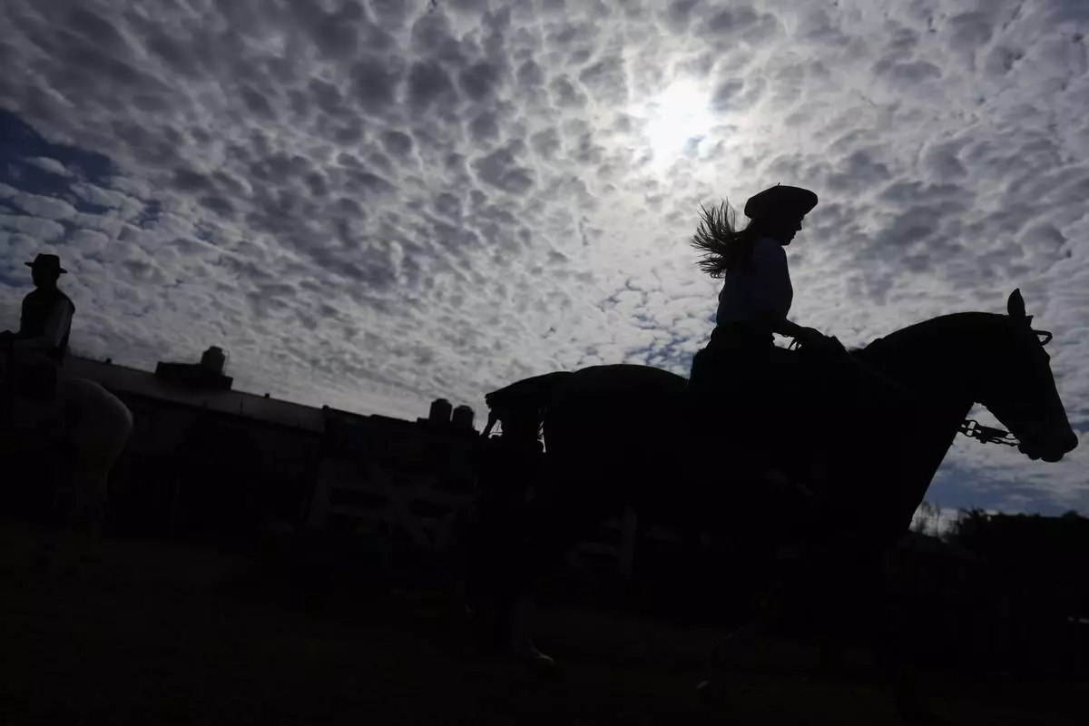 Amalia Rodríguez rides a horse at a rodeo celebrating Independence Day in San Isidro, Argentina, Wednesday, July 9, 2025. (AP Photo/Natacha Pisarenko)
