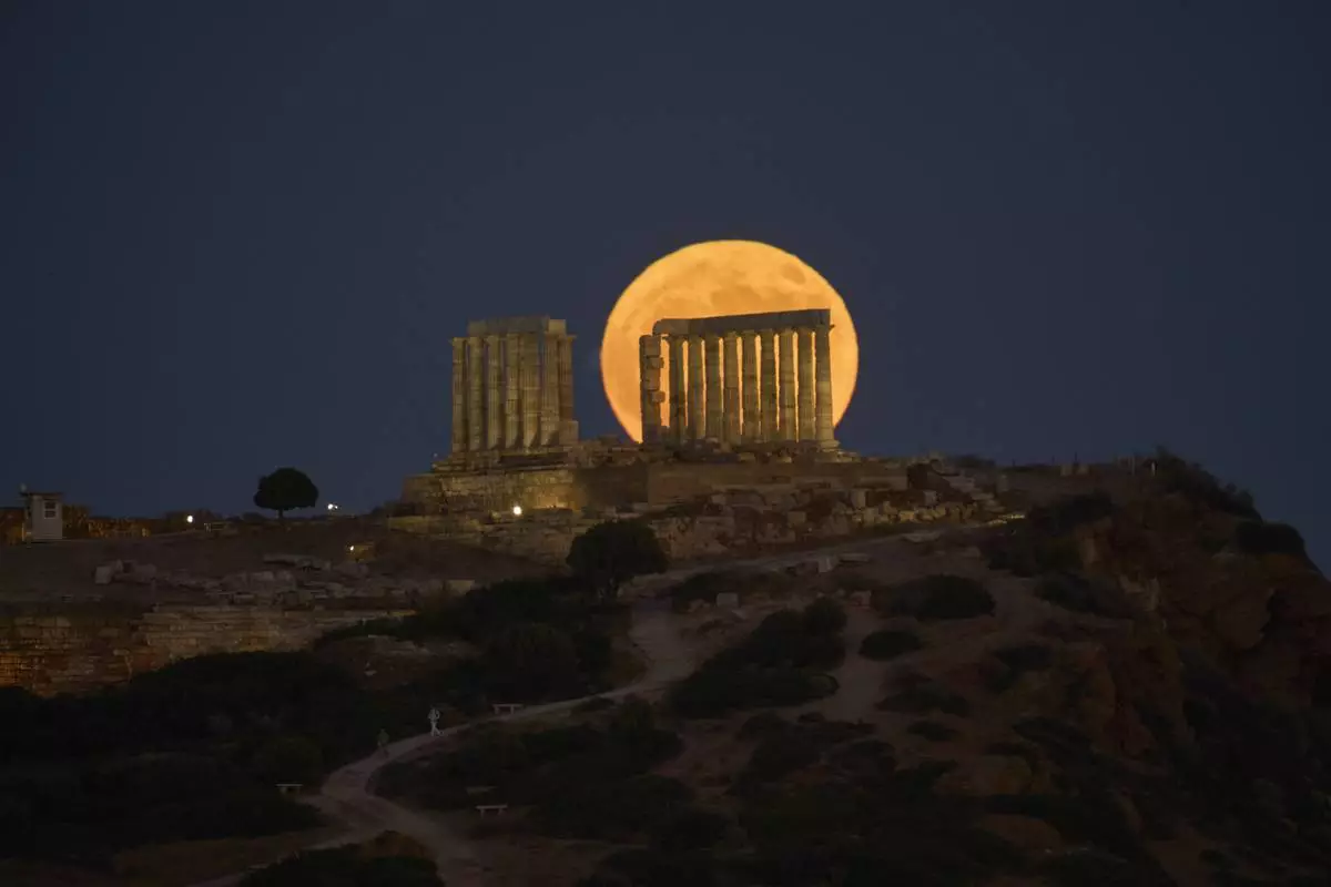 The July full moon, or "Buck Moon," shines over Greece's 2,500-year-old Temple of Poseidon at Cape Sounio, about 70 kilometers (45 miles) south of Athens, Greece, Thursday, July 10, 2025. (AP Photo/Petros Giannakouris)