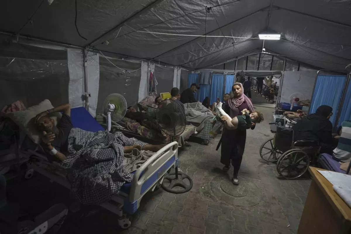 A mother carries her child into a patient treatment tent set up in the yard of Shifa Hospital in Gaza City, Friday, July 4, 2025. (AP Photo/Jehad Alshrafi)