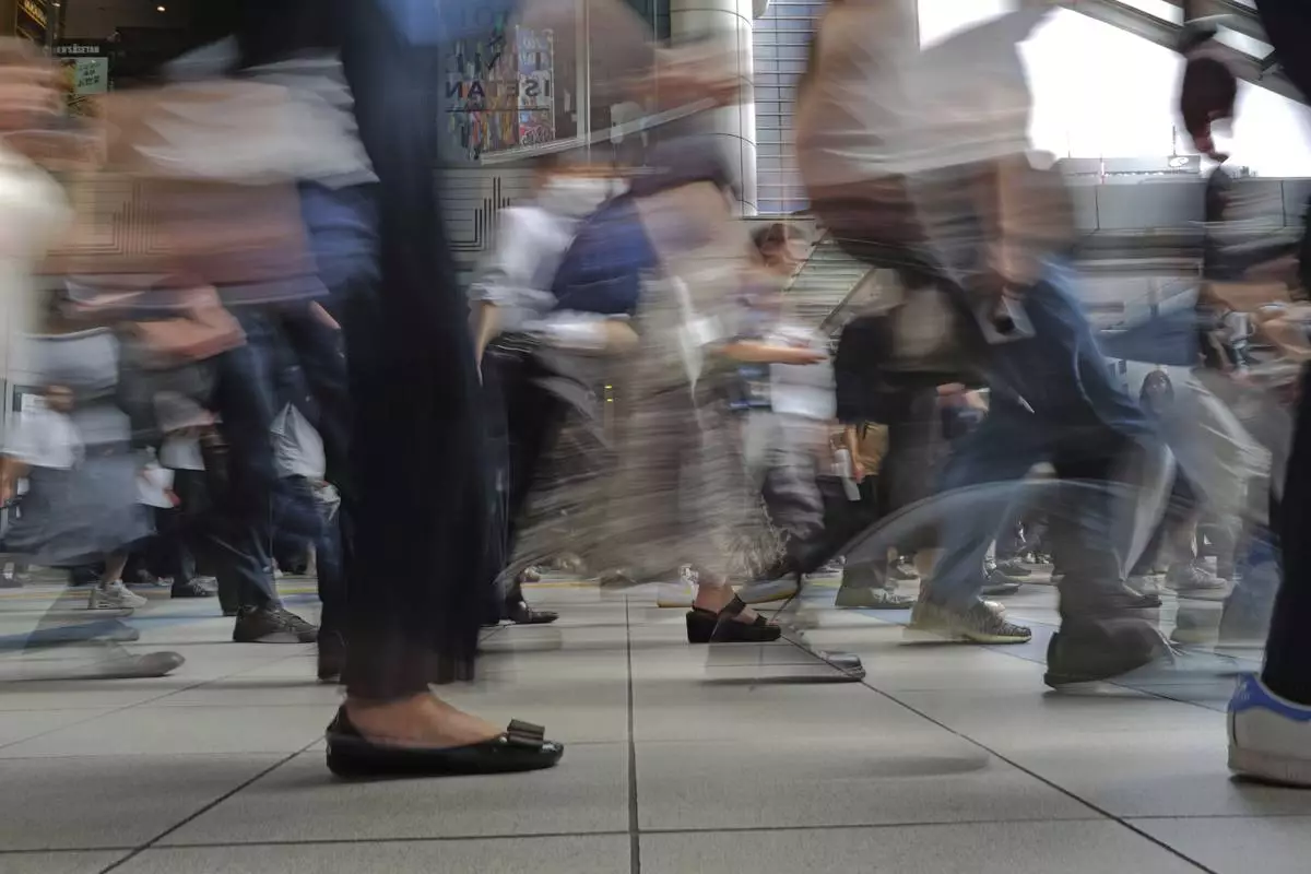 In a slow-shutter-speed photo, people walk through Shinagawa Station in Tokyo on Friday, July 4, 2025. (AP Photo/Eugene Hoshiko)