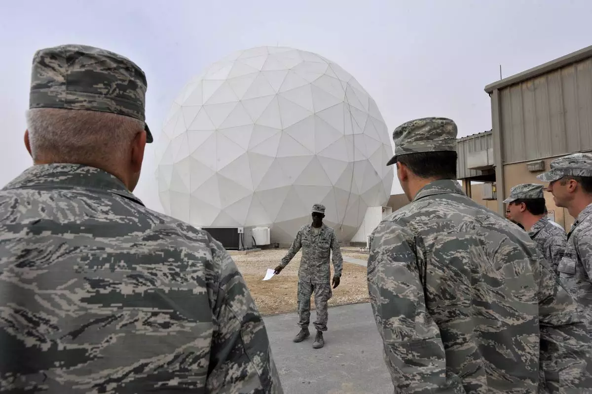 This handout photo from the U.S. Air Force shows the Modernized Enterprise Terminal sits inside a radome at Al Udeid Air Base, Qatar, Jan. 21, 2016. (Master Sgt. Joshua Strang/U.S. Air Force via AP)