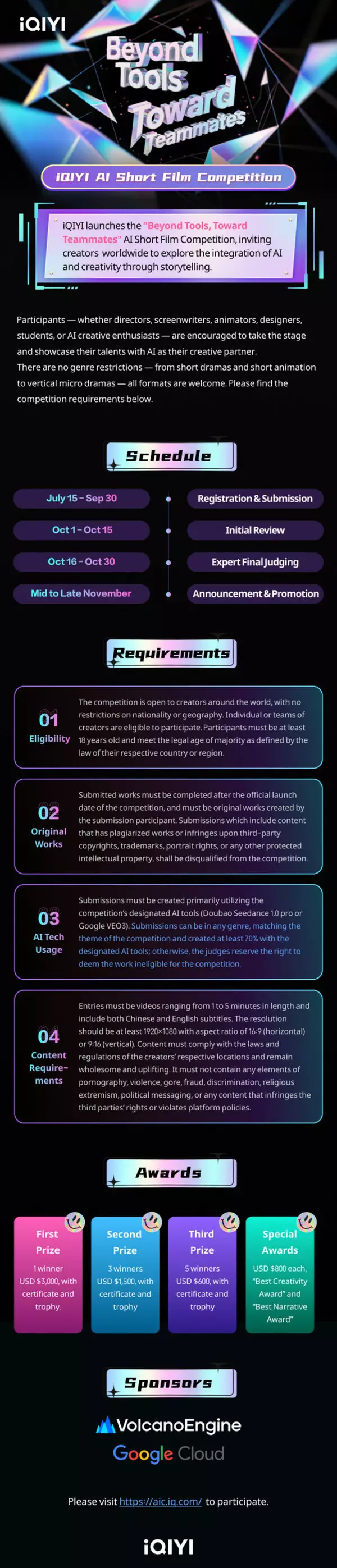 The competition officially opens for registration on July 15th, welcoming creators from all backgrounds and experience levels to submit original works -- from Short dramas and Short Animation to Vertical Micro Dramas-- with no limits on the genres. Creators from around the world can visit the official competition website https://aic.iq.com/ to register for the competition with their video submissions before September 30th, the winners will be announced in November.