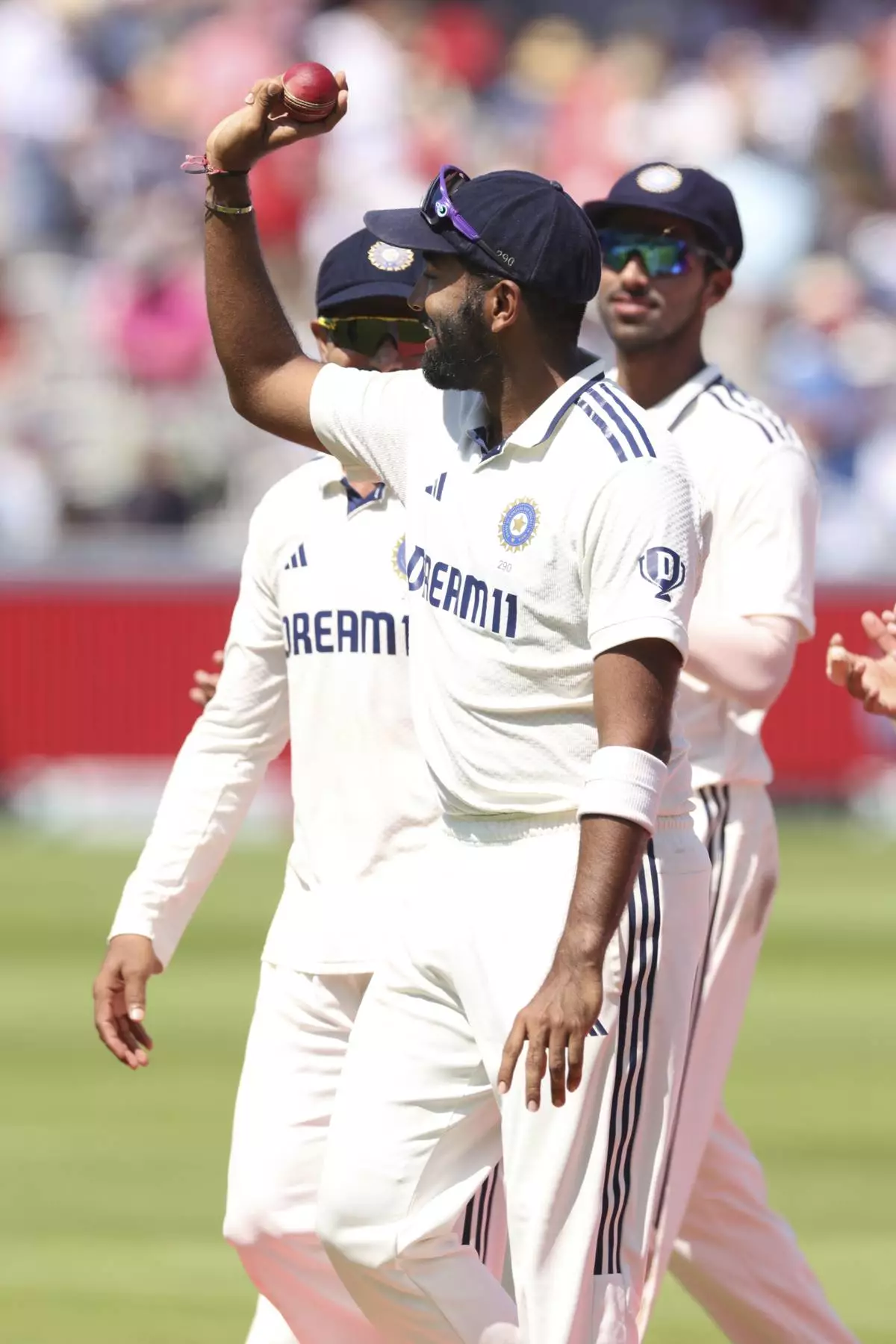India's Jasprit Bumrah shows the ball after taking five wicket during the third cricket test match between England and India at Lord's cricket ground in London, Friday, July 11, 2025. (AP Photo/Richard Pelham)