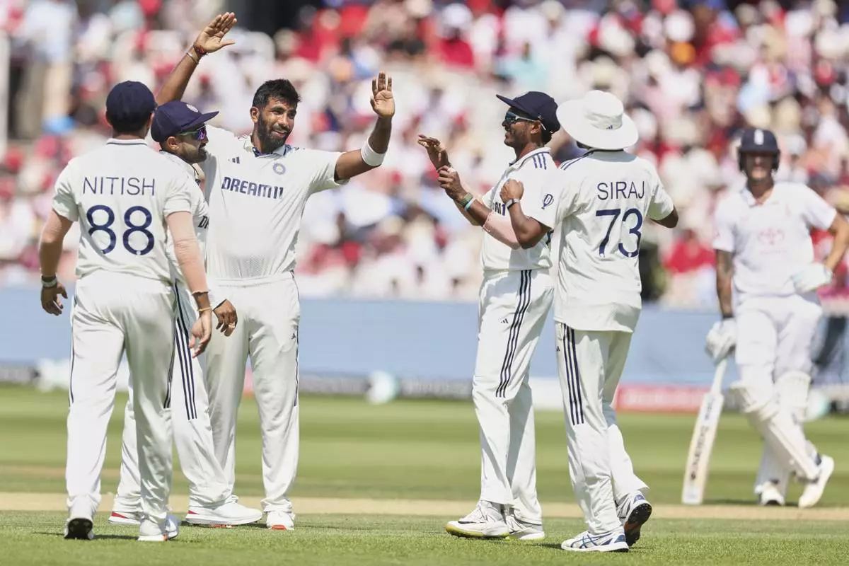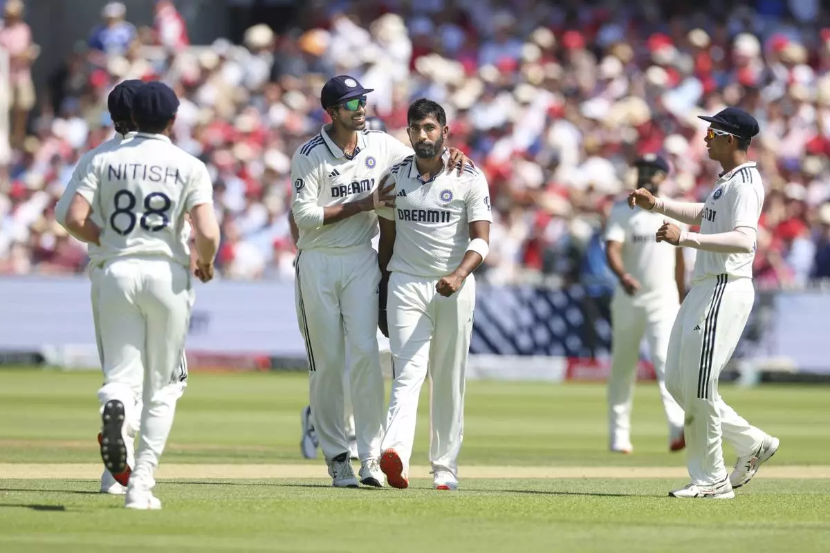 India's Jasprit Bumrah, left, celebrates with teammates after the dismissal of England's Jofra Archer during the third cricket test match between England and India at Lord's cricket ground in London, Friday, July 11, 2025. (AP Photo/Richard Pelham)
