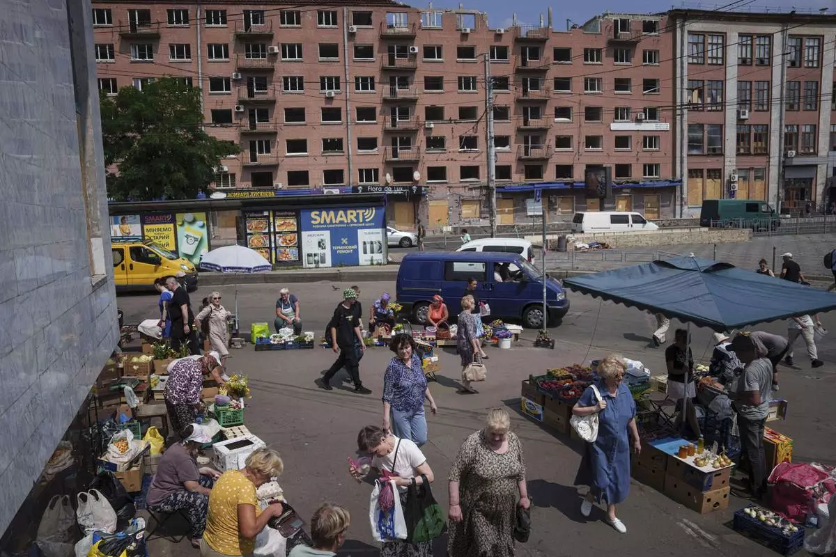 People shop at a street market near a building which was damaged by a Russian attack in Kyiv, Ukraine, on Thursday, July 10, 2025. (AP Photo/Evgeniy Maloletka)