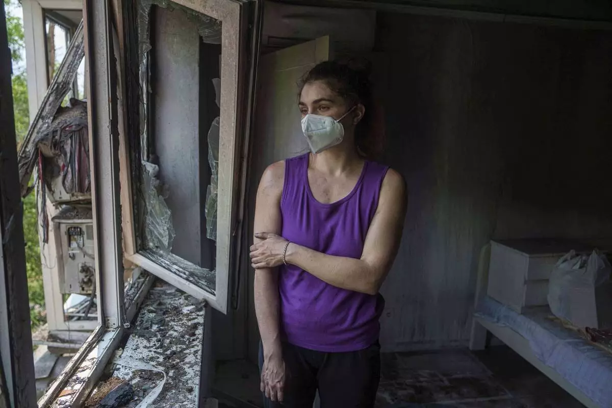 Karyna Holf, 25, stands in her apartment which was damaged by a Russian drone strike in Kyiv, Ukraine, on Thursday, July 10, 2025. (AP Photo/Evgeniy Maloletka)