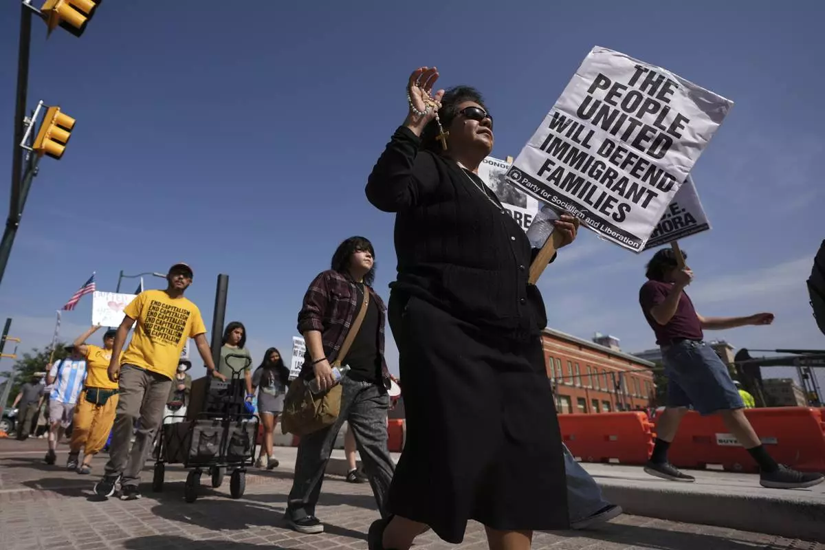 Sister RoseAnn Castilleja, center, holds a Rosary and sign as she marches with other immigration advocates as they protest recent detentions by ICE outside the immigration court in San Antonio, Texas, Tuesday, July 1, 2025. (AP Photo/Eric Gay)
