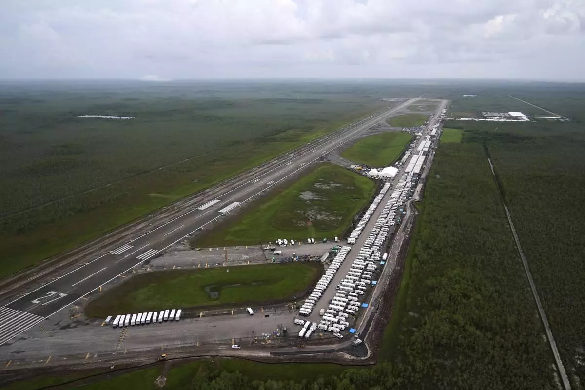 Work progresses on a new migrant detention facility dubbed "Alligator Alcatraz," at Dade-Collier Training and Transition facility in the Florida Everglades, Friday, July 4, 2025, in Ochopee, Fla. (AP Photo/Rebecca Blackwell)