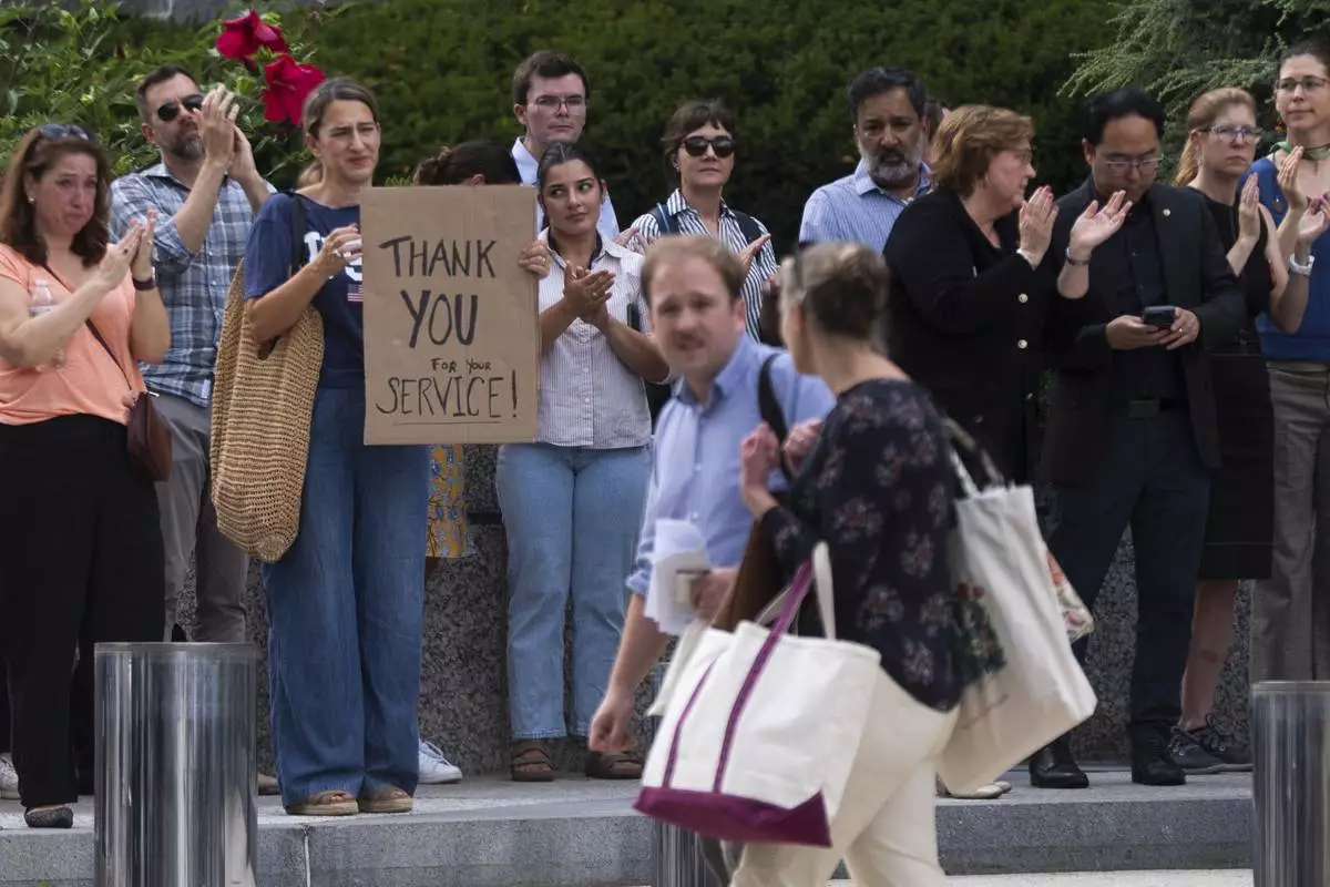 Inside and just outside the State Department, employees spent over an hour applauding their departing colleagues, who got more support -- and sometimes hugs -- from protesters and others gathered across the street.
