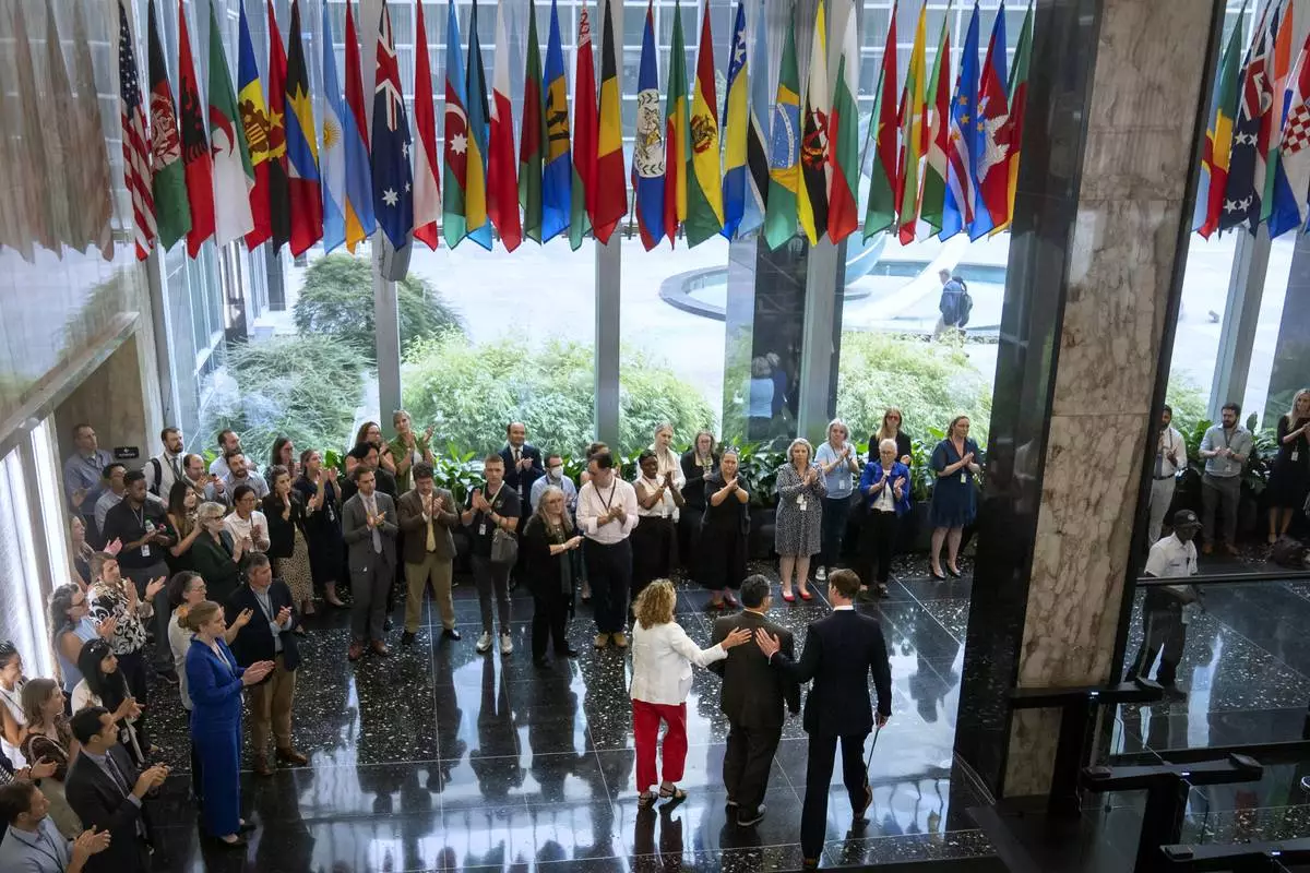 State Department employees applaud as their colleagues walk through the lobby of the State Department headquarters in the Harry S Truman Building, Friday, July 11, 2025, in Washington. (AP Photo/Manuel Balce Ceneta)