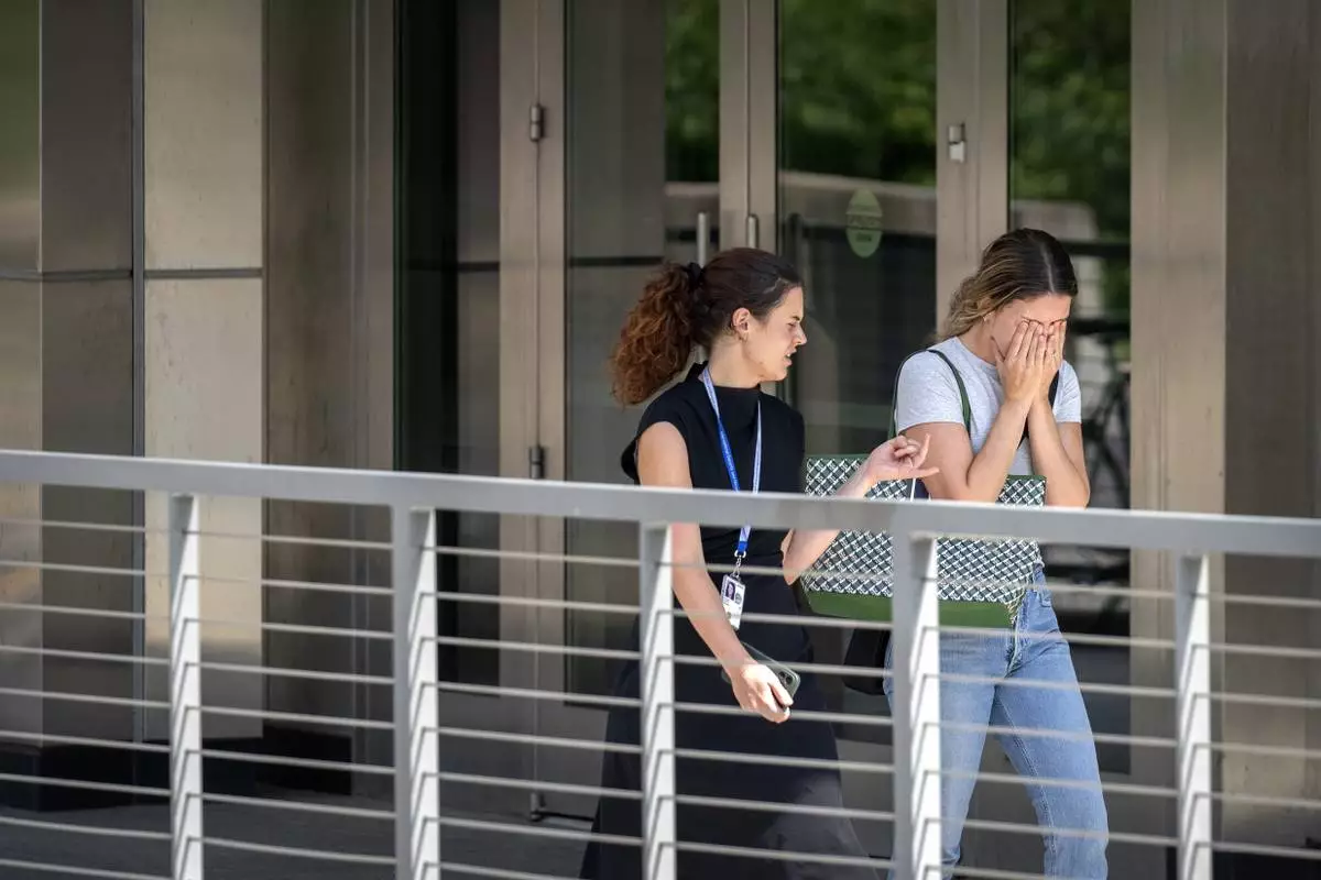 A woman reacts as she walks out of the State Department headquarters, Friday, July 11, 2025, in Washington. (AP Photo/Mark Schiefelbein).
