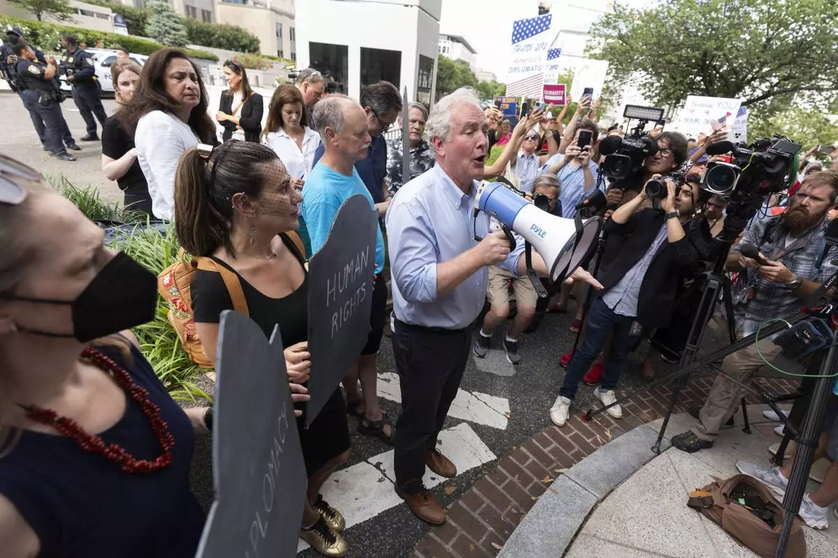 Sen. Chris Van Hollen, D-Md., speaks during a rally outside the headquarters of the State Department, in Washington, Friday, July 11, 2025. (AP Photo/Manuel Balce Ceneta)