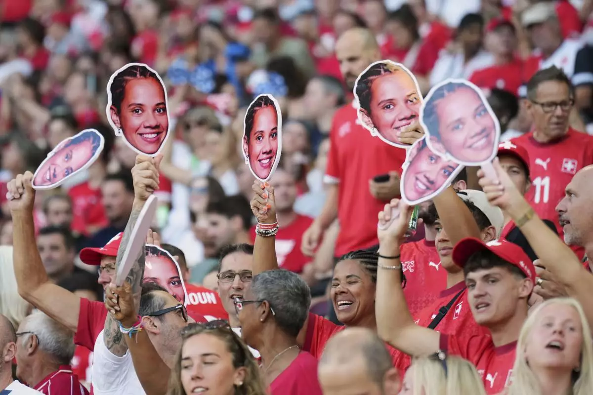Switzerland fans hold pictures of Switzerland's Iman Beney during the Euro 2025, group A, soccer match between Finland and Switzerland at Stade de Geneve in Geneva, Switzerland, Thursday, July 10, 2025. (AP Photo/Alessandra Tarantino)