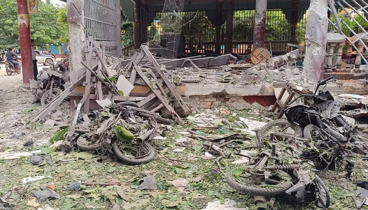 Debris is seen outside a building in a Buddhist monastery that was allegedly hit by the military’s airstrike in Sagaing township in Sagaing region, Myanmar Friday, July 11, 2025. (UGC via AP)