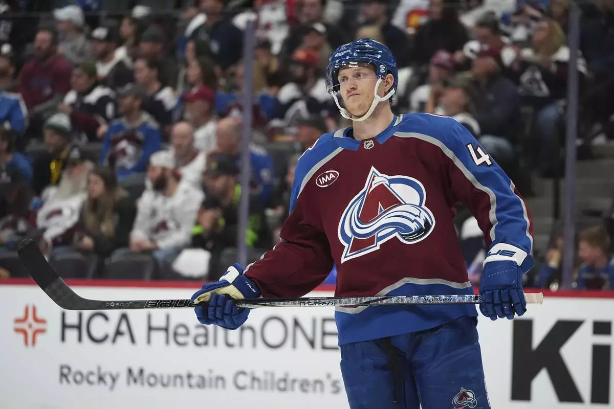 FILE - Colorado Avalanche defenseman Josh Manson (42) in the second period of Game 6 of an NHL first-round hockey playoff series Thursday, May 1, 2025, in Denver. (AP Photo/David Zalubowski, File)