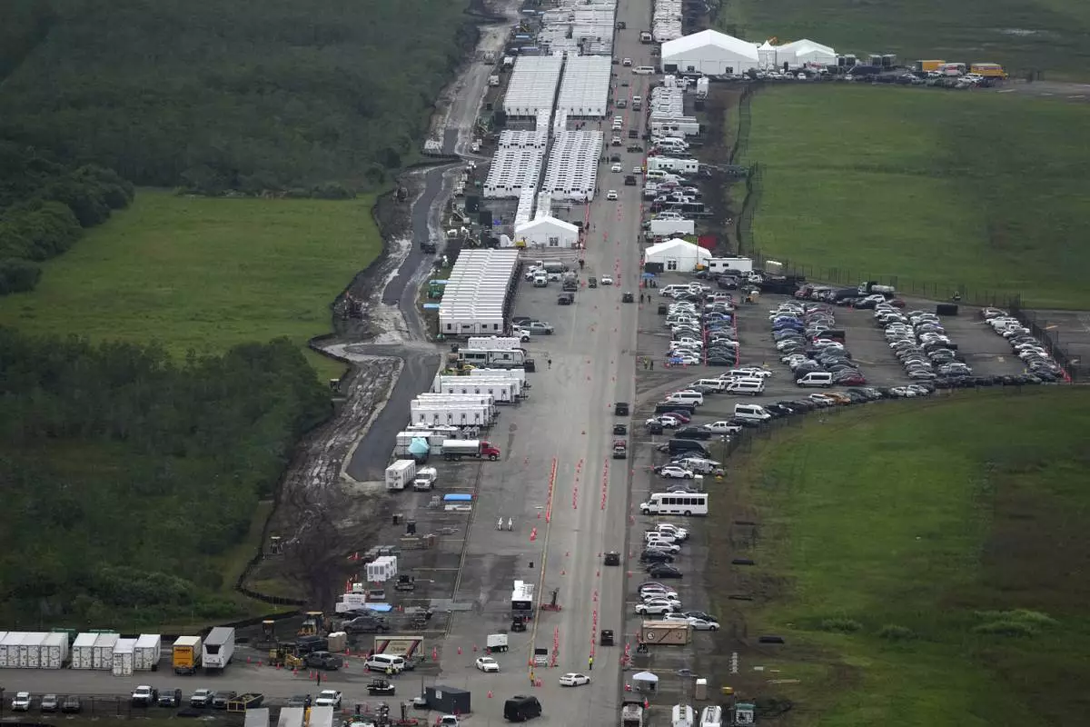 Work progresses on a new migrant detention facility dubbed "Alligator Alcatraz," at Dade-Collier Training and Transition facility in the Florida Everglades, Friday, July 4, 2025, in Ochopee, Fla. (AP Photo/Rebecca Blackwell)