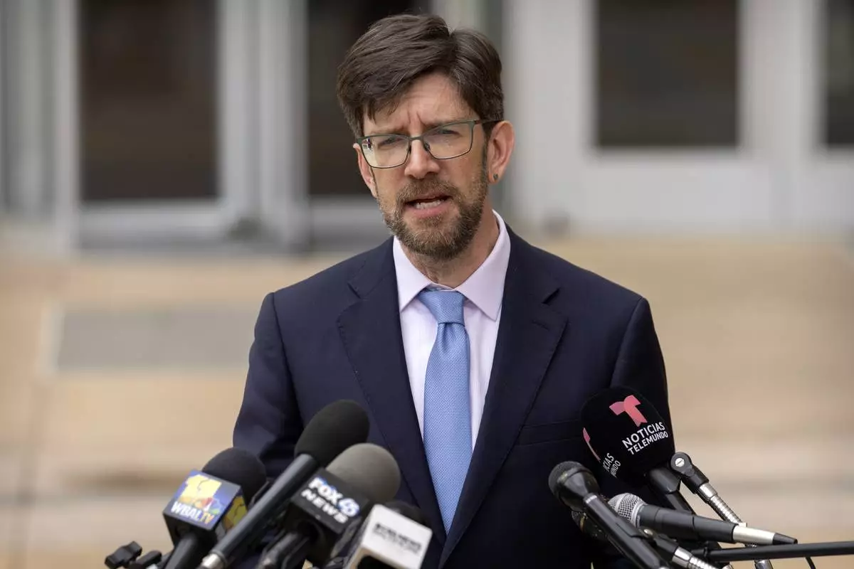 Simon Sandoval-Moshenberg, an attorney for Kilmar Abrego Garcia, speaks to reporters after a hearing at the U.S. District Court in Greenbelt, Md., Monday, July 7, 2025. (AP Photo/Mark Schiefelbein)
