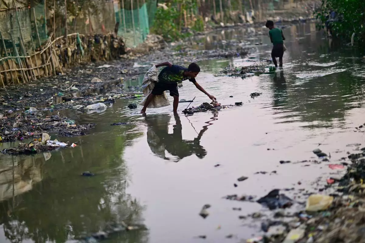 In a drainage ditch next to a row of stinking latrines, 13-year-old Rahamot Ullah wades up to his waist in water clouded with raw sewage, plucking from the muck discarded pieces of plastic. Five hours of rummaging through the waste will generally net him enough plastic to trade for around 50 taka (40 cents).