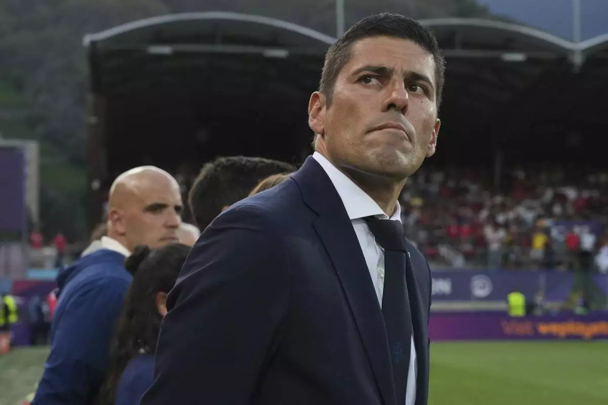 Portugal head coach Francisco Neto concentrates prior the Women's Euro 2025, group B, soccer match between Portugal and Belgium at Stade de Tourbillon in Sion, Switzerland, Friday, July 11, 2025. (AP Photo/Alessandra Tarantino)