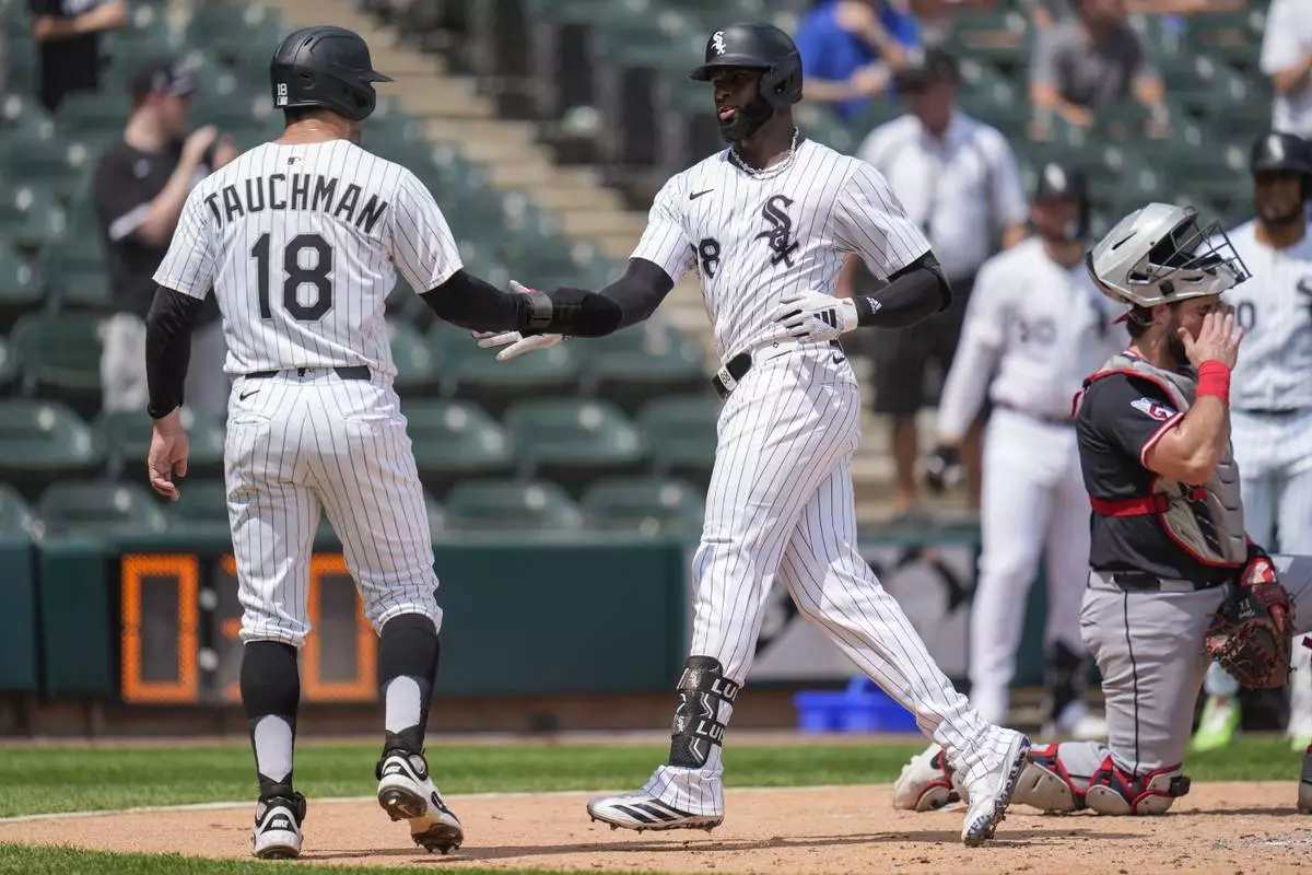 Chicago White Sox's Luis Robert Jr., right, celebrates with Mike Tauchman (18) after hitting a two-run home run during the second inning of the first baseball game of a doubleheader against the Cleveland Guardians, Friday, July 11, 2025, in Chicago. (AP Photo/Erin Hooley)