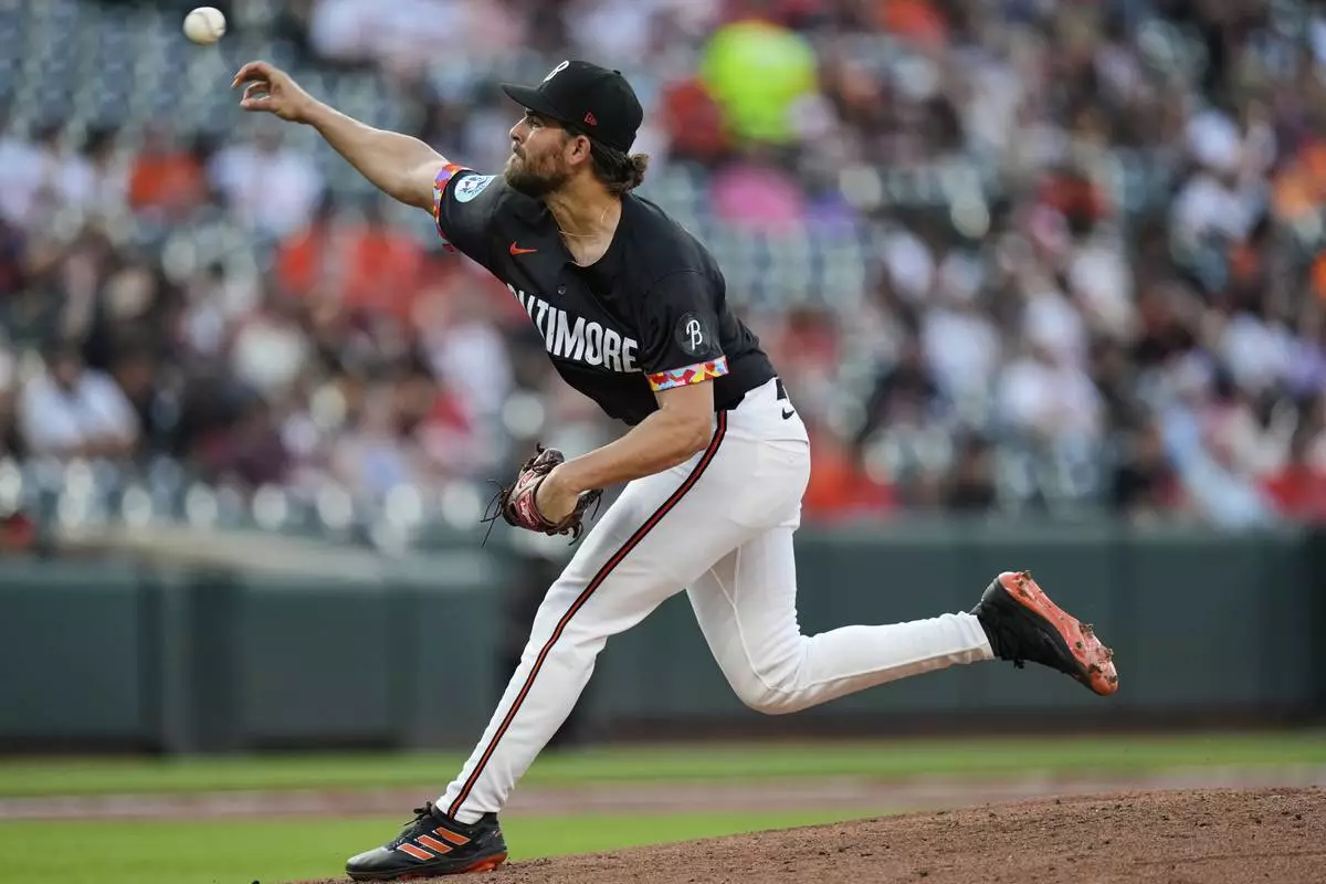 Baltimore Orioles starting pitcher Dean Kremer delivers during the second inning of a baseball game against the Miami Marlins, Friday, July 11, 2025, in Baltimore. (AP Photo/Stephanie Scarbrough)