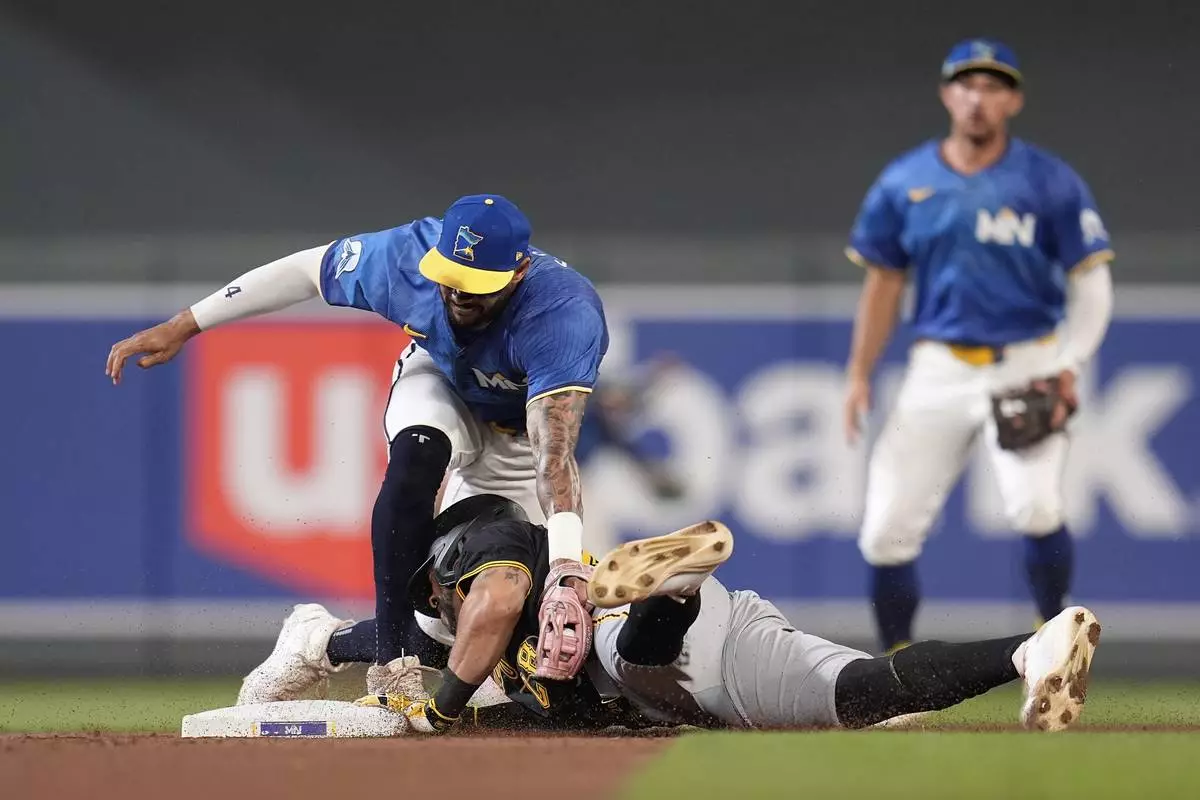 Pittsburgh Pirates' Tommy Pham, bottomleft, is tagged out by Minnesota Twins shortstop Carlos Correa, top left, during the seventh inning of a baseball game Friday, July 11, 2025, in Minneapolis. Correa was injured on the play. (AP Photo/Abbie Parr)