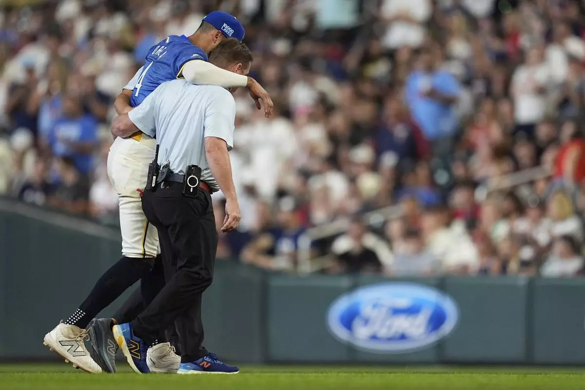Minnesota Twins shortstop Carlos Correa (4) leaves a baseball game after sustaining an injury during the seventh inning against the Pittsburgh Pirates, Friday, July 11, 2025, in Minneapolis. (AP Photo/Abbie Parr)