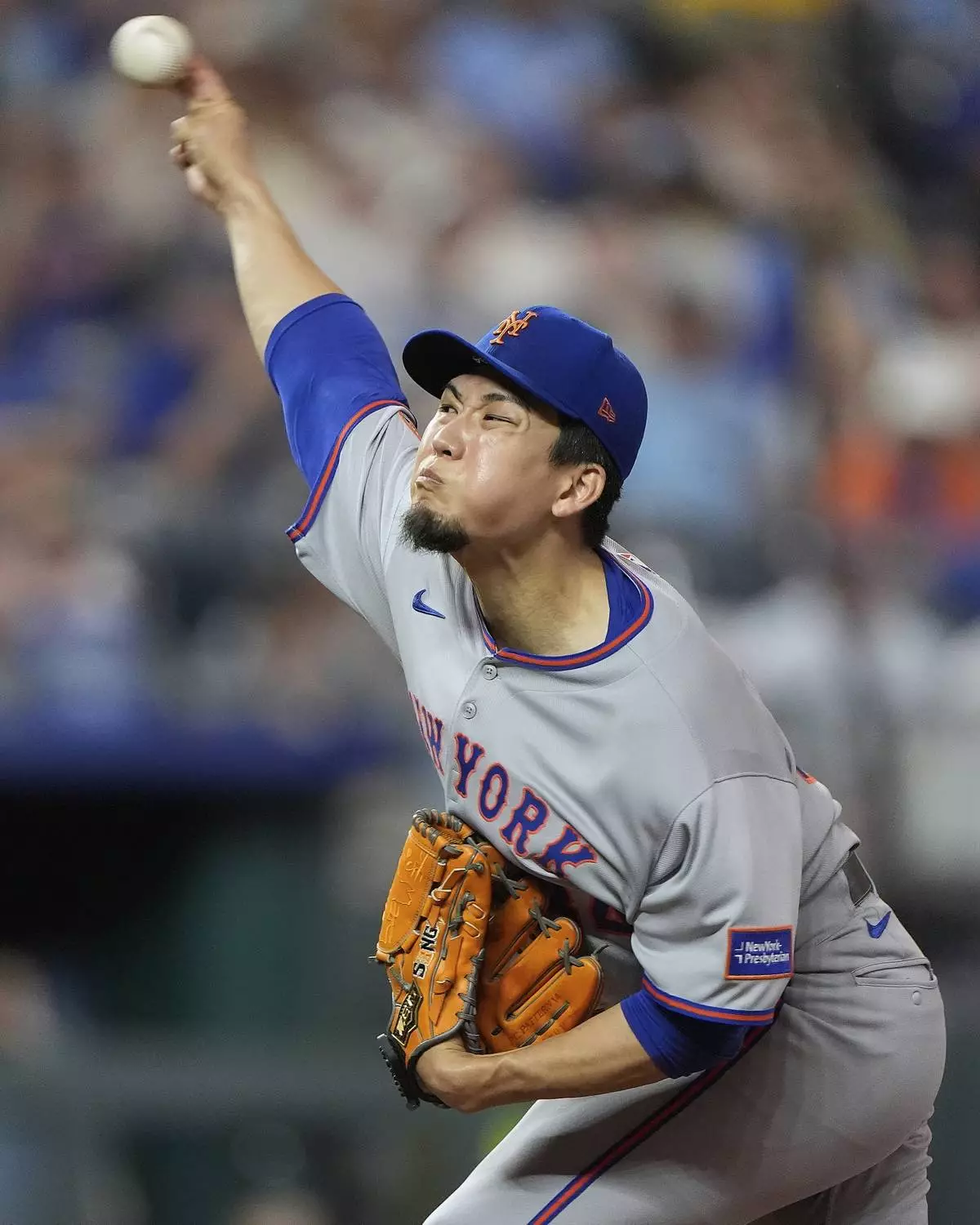 New York Mets starting pitcher Kodai Senga throws during the first inning of a baseball game against the Kansas City Royals, Friday, July 11, 2025, in Kansas City, Mo. (AP Photo/Charlie Riedel)