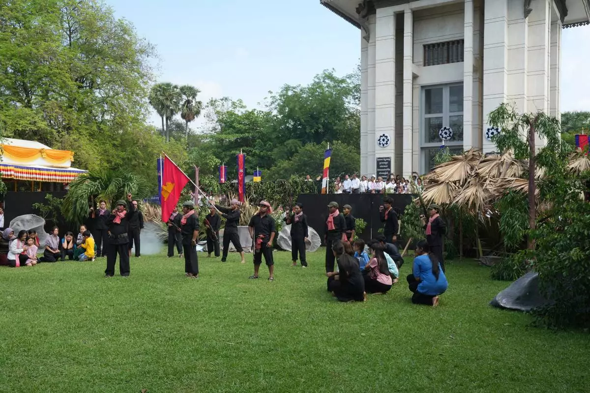 FILE - Cambodian students of Royal University of Fine Arts reenact torture and execution by the Khmer Rouge during their reign of terror in the 1970s, in an event hosted by the ruling Cambodian People's Party to mark the annual Day of Anger at Choeung Ek, a former Khmer Rouge "killing field," on the outskirt of Phnom Penh, Cambodia Wednesday, May 20, 2015. (AP Photo/Heng Sinith, File)