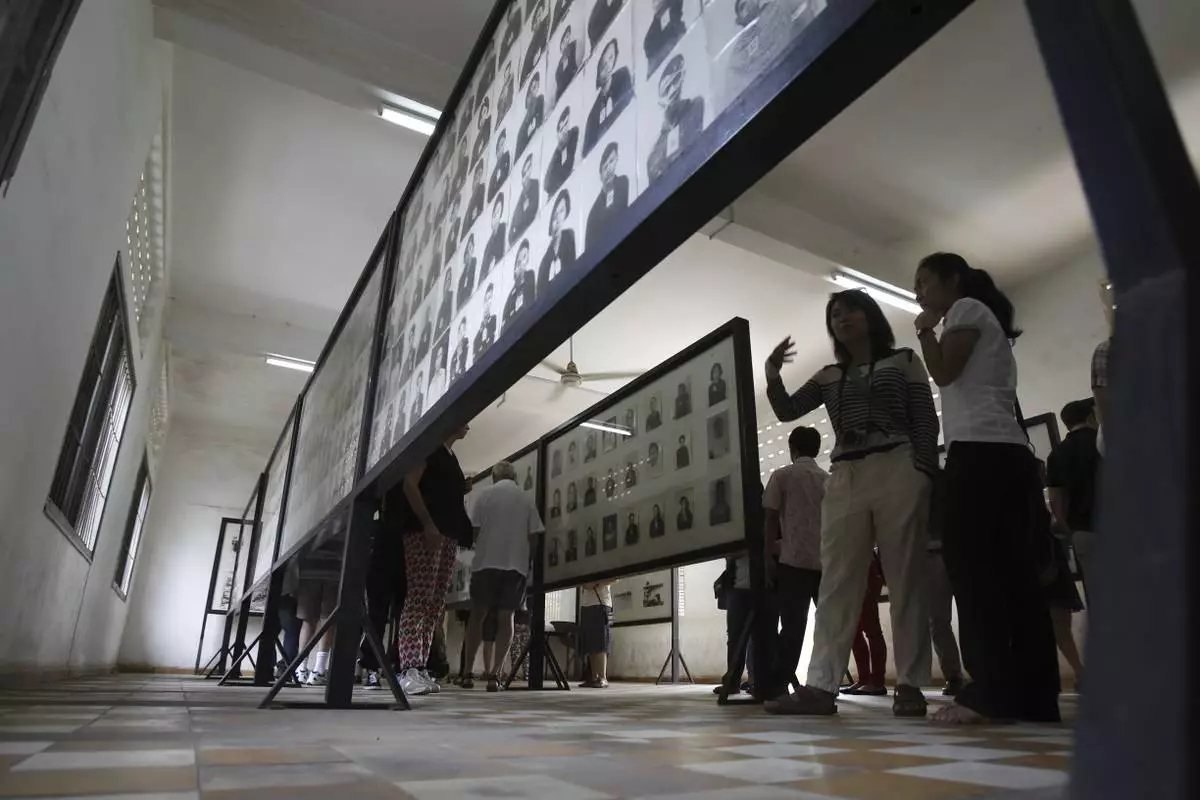 FILE - Tourists look at portraits of genocide victims in Khmer Rouge regime at the Tuol Sleng Genocide Museum, formerly the most notorious Khmer Rouge prison, in Phnom Penh, Cambodia, on July 10, 2014. (AP Photo/Heng Sinith, File)