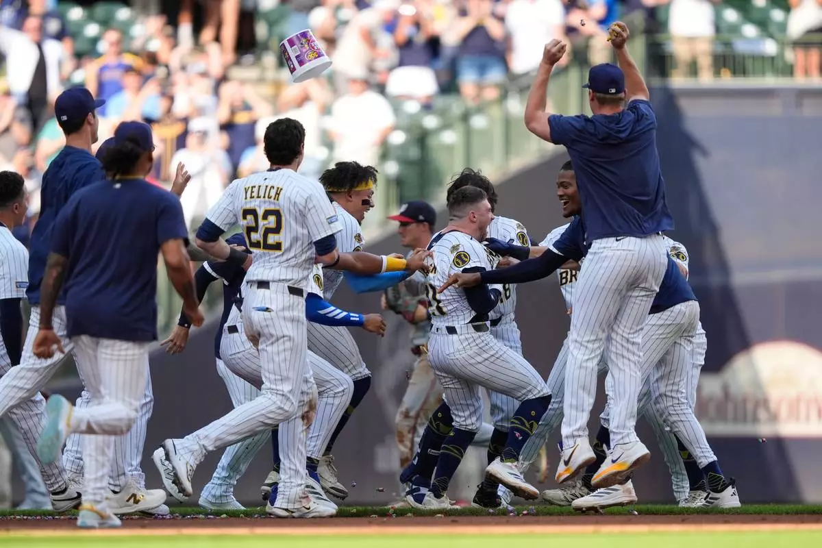 Milwaukee Brewers' Caleb Durbin (21) celebrates with teammates after driving in the winning run with a walk off single in the ninth inning of a baseball game against the Washington Nationals, Saturday, July 12, 2025, in Milwaukee. (AP Photo/Aaron Gash)