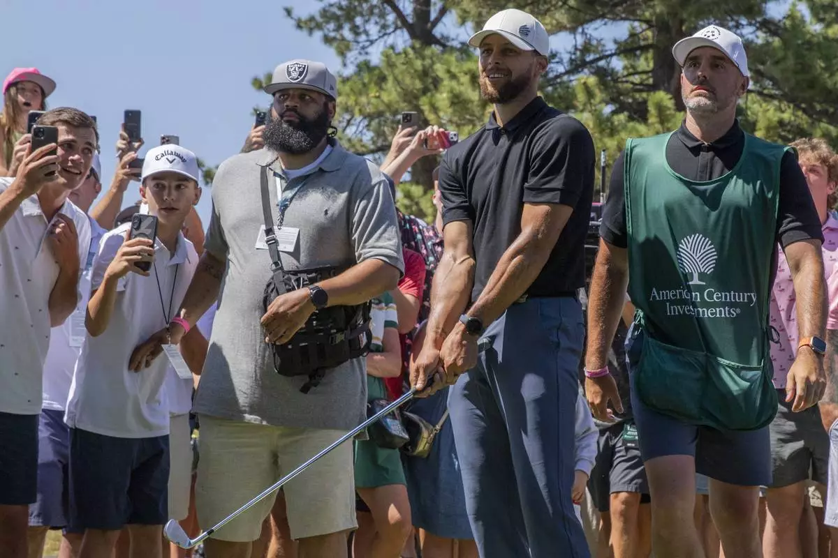 Stephen Curry hits from the spectator area on the 18th hole during the first round of the American Century celebrity golf tournament at Edgewood Tahoe Golf Course in Stateline, Nevada, on Friday, July 11, 2025. His caddie Jason Richards, right, is seen next to him. (Santiago Mejia/San Francisco Chronicle via AP)
