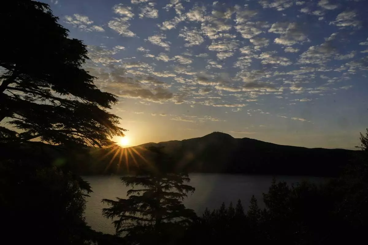 The sun raises over Castel Gandolfo where Pope Leo XIV is scheduled to deliver the Angelus prayer in his summer retreat, Sunday, July 13, 2025. (AP Photo/Gregorio Borgia)