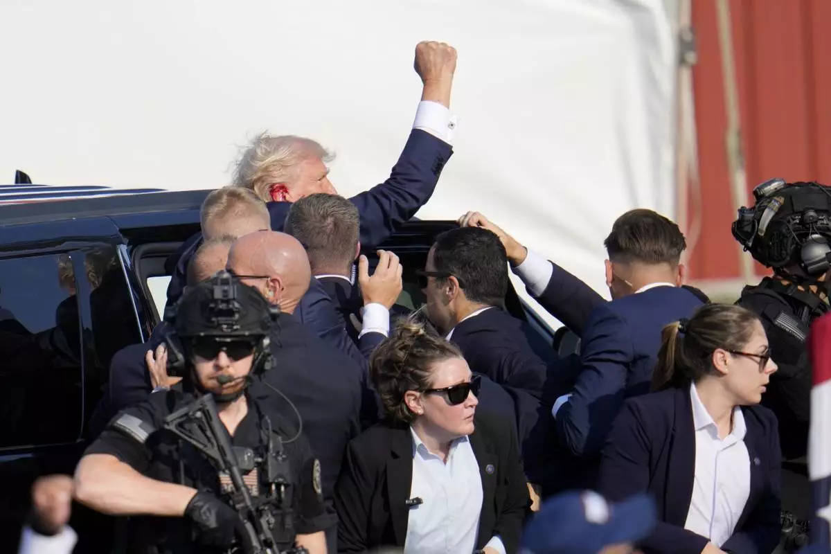 FILE - Republican presidential candidate former President Donald Trump is surrounded by U.S. Secret Service agents at a campaign rally, July 13, 2024, in Butler, Pa. (AP Photo/Evan Vucci, File)
