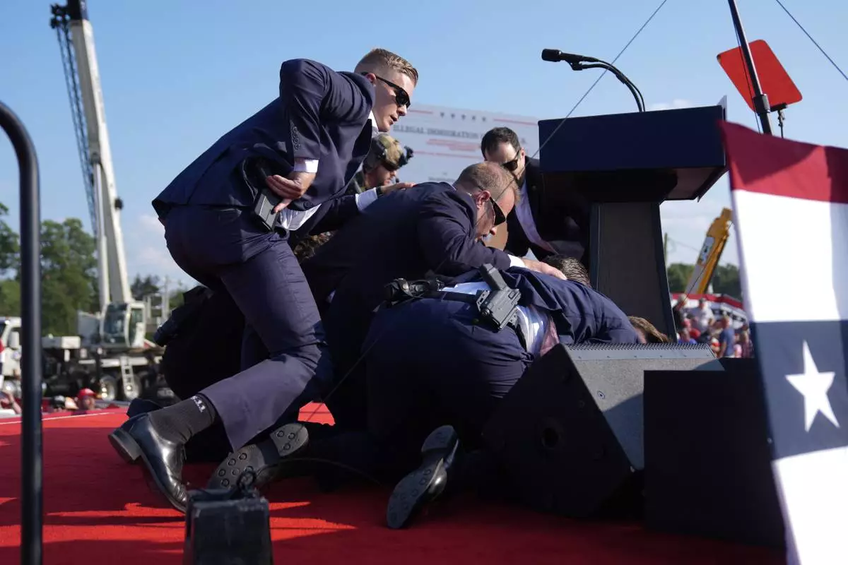 FILE - Republican presidential candidate former President Donald Trump is covered by U.S. Secret Service agents at a campaign rally, July 13, 2024, in Butler, Pa. (AP Photo/Evan Vucci, File)
