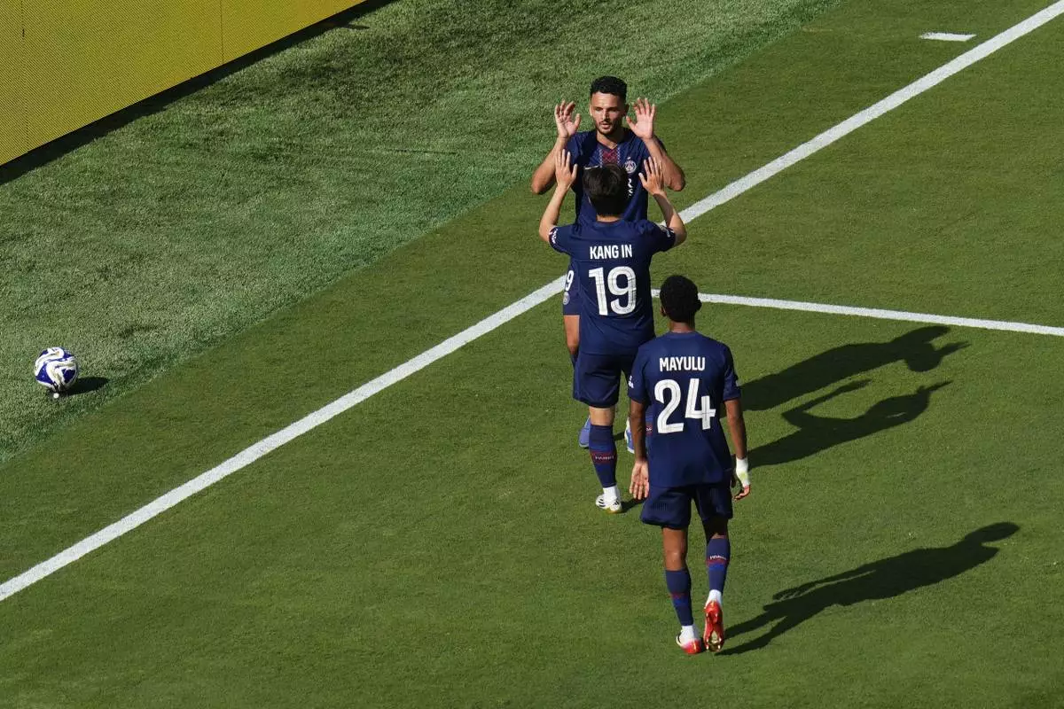 Paris Saint-Germain's Goncalo Ramos (9), rear, celebrates his goal with Lee Kang-in (19) and Senny Mayulu (24) during the Club World Cup semifinal soccer match between PSG and Real Madrid in East Rutherford, N.J., Wednesday, July 9, 2025. (AP Photo/Pamela Smith)