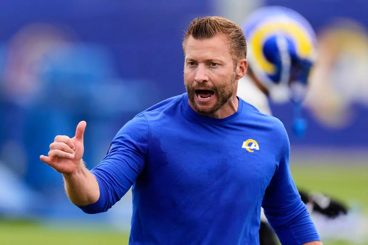FILE - Los Angeles Rams head coach Sean McVay gestures during the NFL football team's organized team activities Wednesday, May 28, 2025, in Los Angeles. (AP Photo/Mark J. Terrill, File)