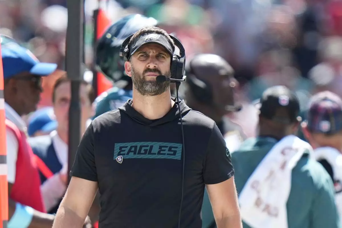 FILE - Philadelphia Eagles head coach Nick Sirianni walks the sidelines during an NFL football game against the Tampa Bay Buccaneers, Sunday, Sept. 29, 2024, in Tampa, Fla. (AP Photo/Peter Joneleit, File)