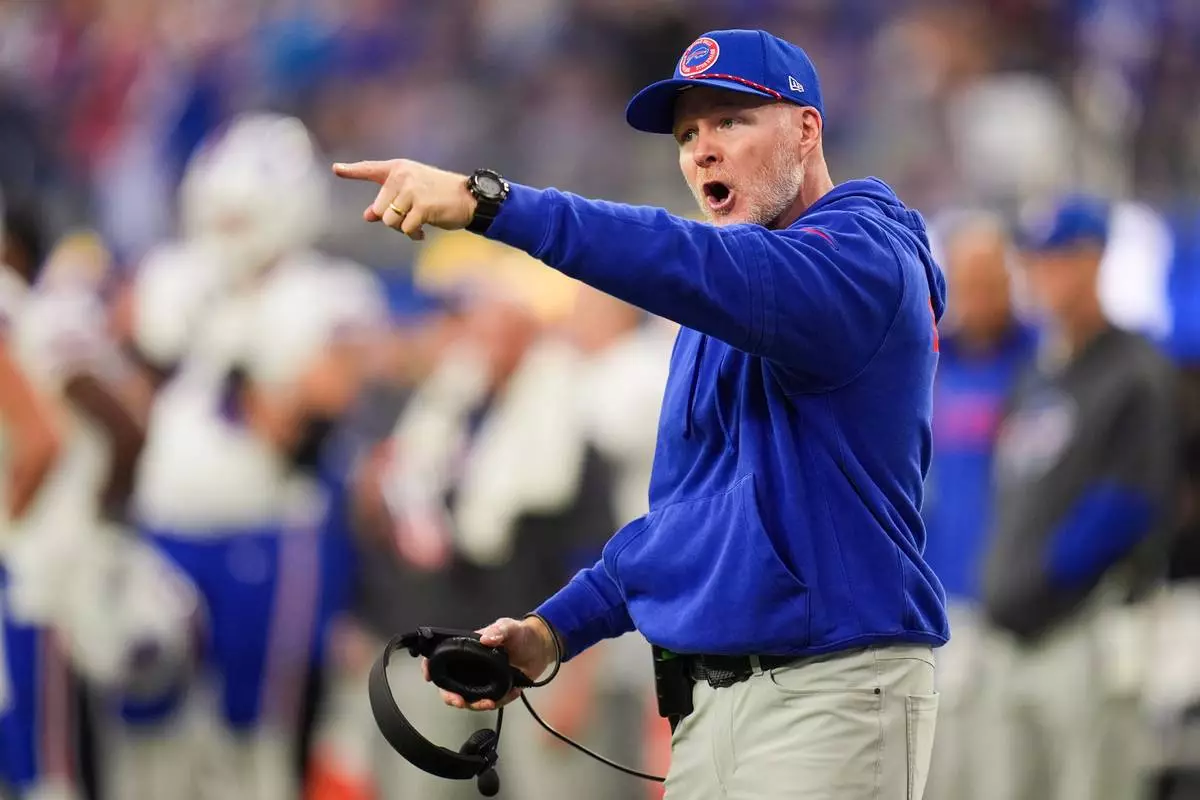 FILE - Buffalo Bills head coach Sean McDermott reacts during the second half of an NFL football game against the Los Angeles Rams, Sunday, Dec. 8, 2024, in Inglewood, Calif. (AP Photo/Gregory Bull, File)