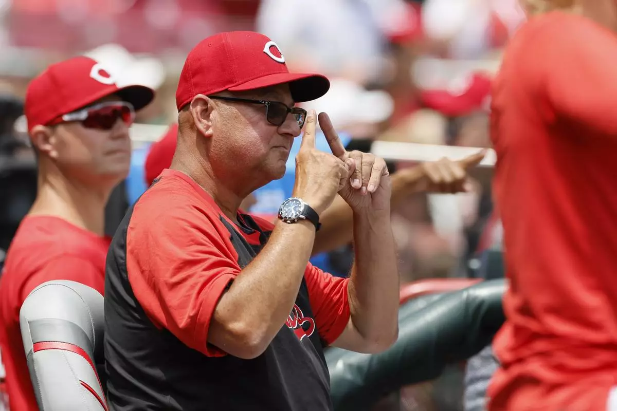 Cincinnati Reds manager Terry Francona signals to his team against the Colorado Rockies during the third inning of a baseball game, Sunday, July 13, 2025, in Cincinnati. (AP Photo/Jay LaPrete)