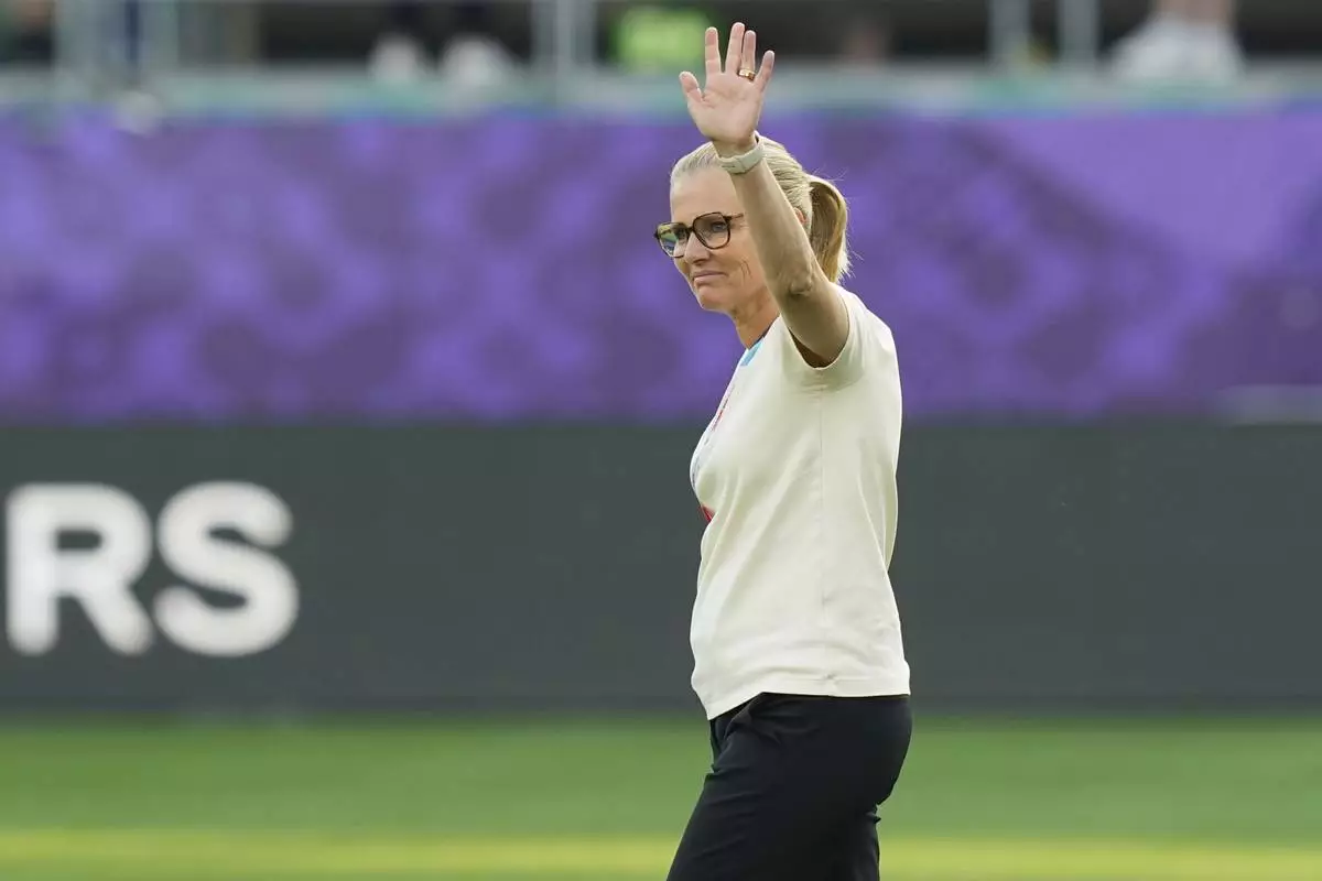 England head coach Sarina Wiegman waves prior the Women's Euro 2025, group D, soccer match between England and Wales at Arena St. Gallen in St. Gallen, Switzerland, Sunday, July 13, 2025. (AP Photo/Martin Meissner)