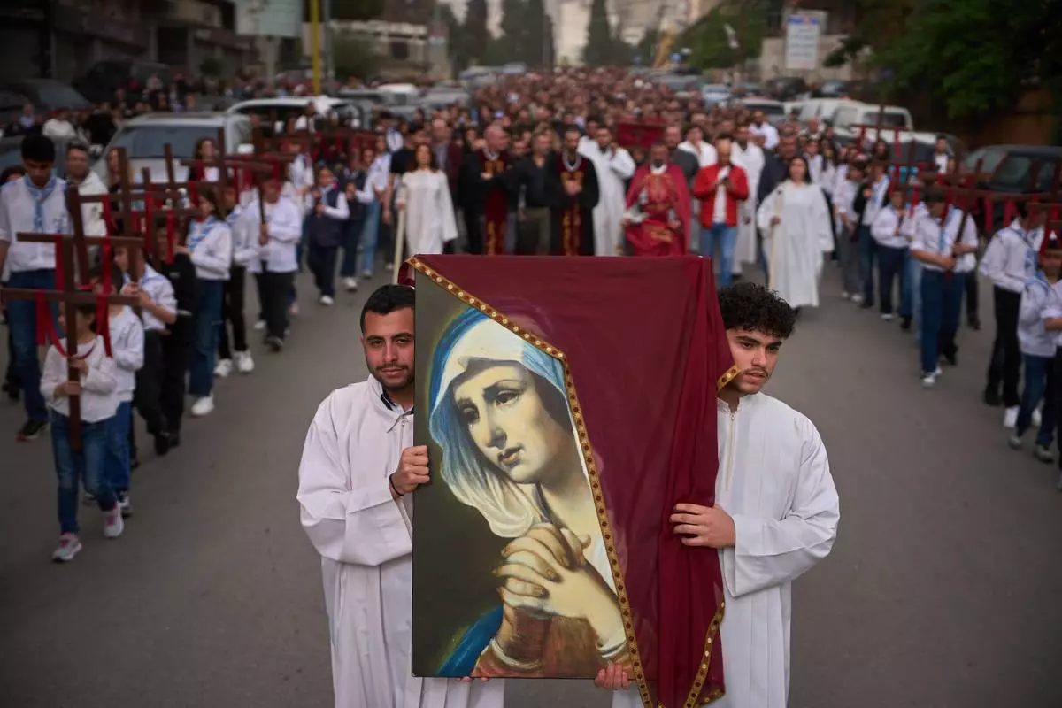 Parishioners walk in a procession after a Good Friday Mass at St. Anthony Church, which was devoted to expressing solidarity with Christian villagers in southern Lebanon displaced by the war in Jdeideh, a suburb of Beirut, Lebanon, Friday, April 3, 2026. (AP Photo/Emilio Morenatti)