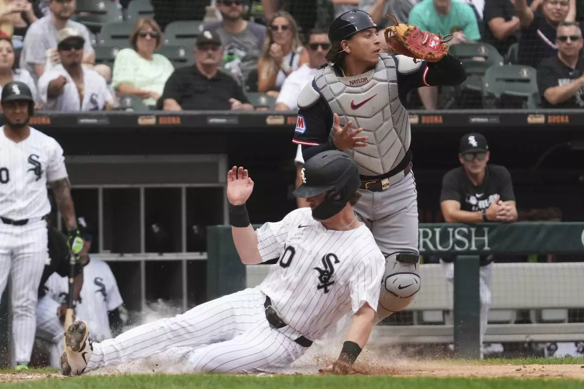 Chicago White Sox's Chase Meidroth, bottom, scores on a one-run single by Austin Slater as Cleveland Guardians catcher Bo Naylor looks to the field during the fifth inning of a baseball game in Chicago, Sunday, July 13, 2025. (AP Photo/Nam Y. Huh)