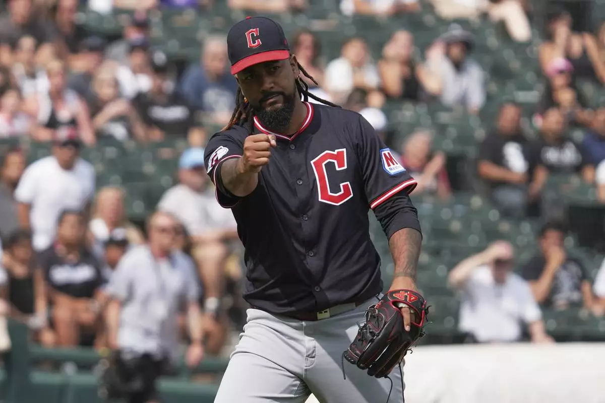 Cleveland Guardians relief pitcher Emmanuel Clase celebrates after his team defeated the Chicago White Sox in a baseball game in Chicago, Sunday, July 13, 2025. (AP Photo/Nam Y. Huh)