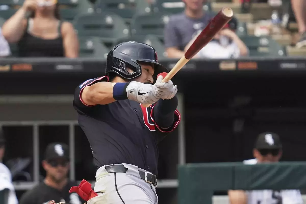 Cleveland Guardians' Steven Kwan hits a sacrifice fly during the 10th inning of a baseball game against the Chicago White Sox in Chicago, Sunday, July 13, 2025. (AP Photo/Nam Y. Huh)