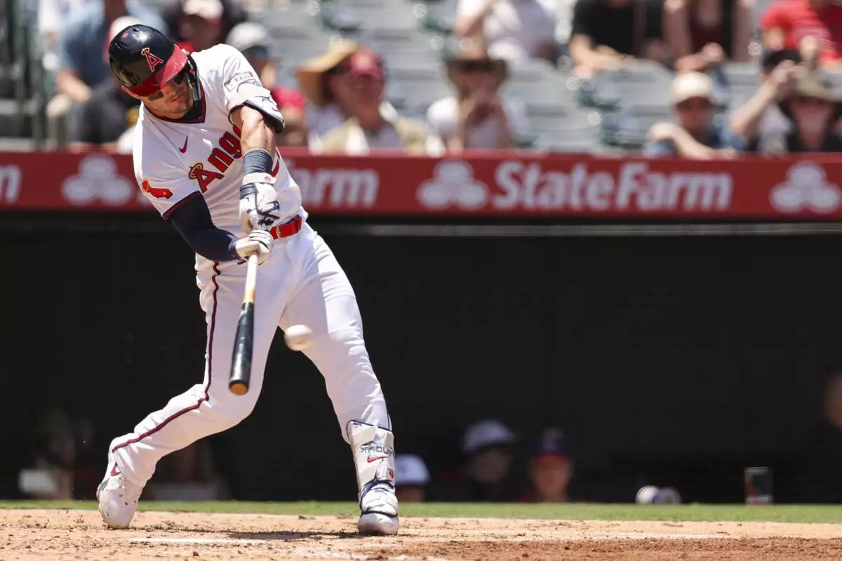Los Angeles Angels' Mike Trout hits an RBI single during the third inning of a baseball game against the Arizona Diamondbacks in Anaheim, Calif., Sunday, July 13, 2025. (AP Photo/Jessie Alcheh)